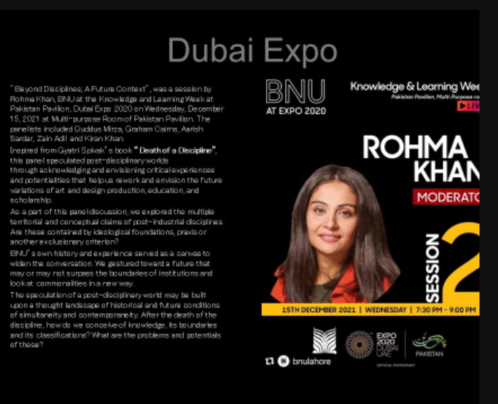 “Beyond Disciplines; A Future Context”, was a session moderated by Rohma Khan at the Knowledge and Learning Week at Pakistan Pavilion, Dubai Expo 2020 on Wednesday, December 15, 2021 at Multi-purpose Room of Pakistan Pavilion. The panelists included Quddus Mirza, Graham Cairns, Aarish Sardar, Zain Adil and Kiran Khan.