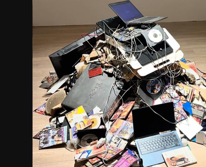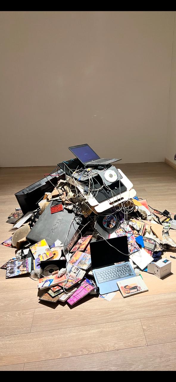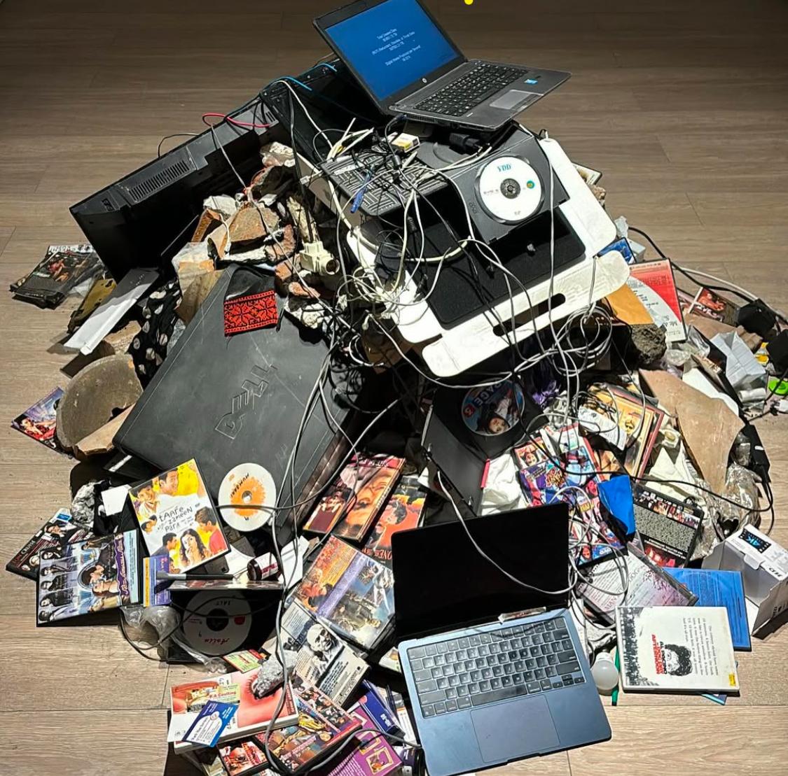 Data Detritus is a collaborative installation by artist-researcher Rohma Khan and Artversation.com, addressing e-waste, textile waste, and digital waste. Using discarded digital hardware, worn-out textiles, and a dystopian display, it highlights that 90% of emerging data is R.O.T. (redundant, obsolete, trivial). The work engages with Ejaz Gallery’s framing legacy in Lahore, while curator Aaarish subverts traditional notions of what deserves to be framed. As part of a multisensory exhibition, Digital Leftover critiques AI’s impact on art and humanity, urging reflection on the wasteful byproducts of our digital age.
