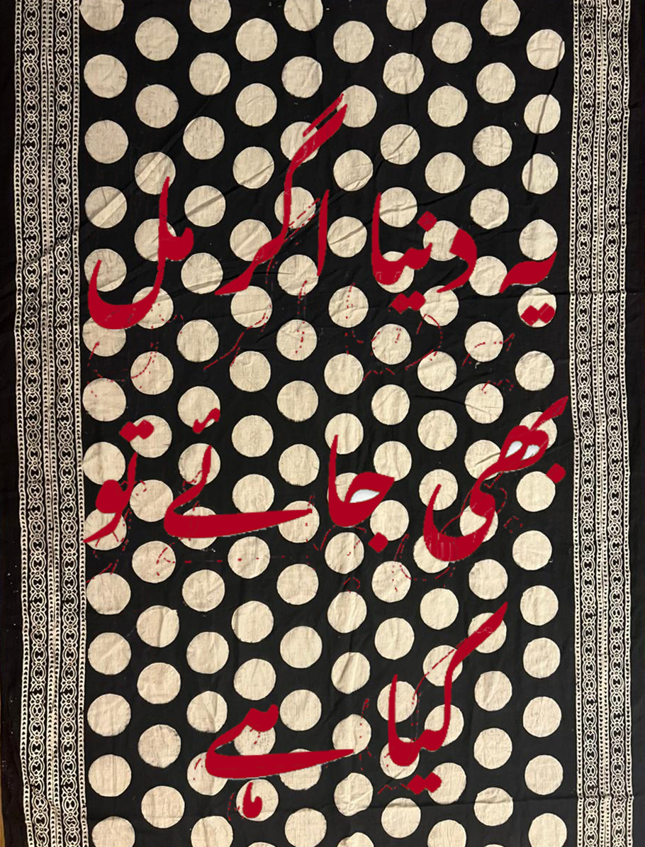 This work arises from Sahir Ludhianvi’s iconic poem Yeh Duniya Agar Mil Bhi Jaye Toh Kya Hai, a searing meditation on desire, disillusionment, and the cost of pursuit. Sahir’s life, marked by abandonment, resistance, and pain of sorts, offers a poetic and political compass through which I examine the intimate terrains of meaning, mortality, and creative purpose. At the center of this piece is a sari; a delicate, handcrafted fabric that entangled me in moment of near-death. The sari while soaking the weight of the event, also soaks many intergenerational stories.
