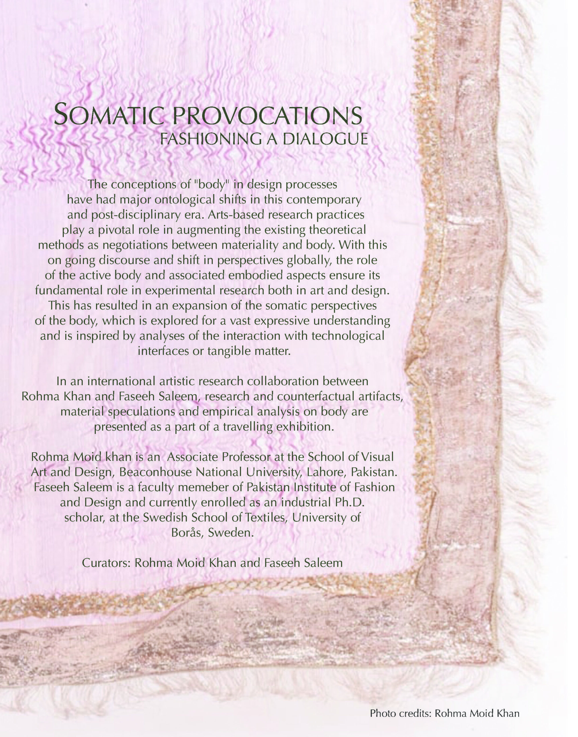 In an international artistic research collaboration between Rohma Khan, Associate Professor at the School of Visual Art and Design, Beaconhouse National University, and Faseeh Saleem faculty at Pakistan Institute of Fashion and Design, currently enrolled as an industrial Ph.D. scholar, at the Swedish School of Textiles, University of Borås, Sweden, research and counterfactual artifacts, material speculations and empirical analysis on the body is presented as a part of a traveling exhibition.